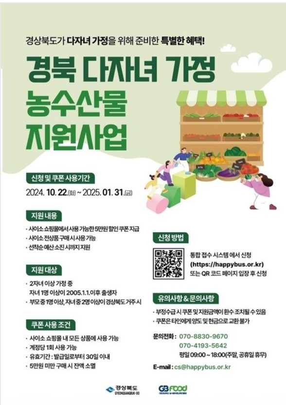- 선정된 가정은 경북고향장터(사이소) 에서 사용할 수 있는 온라인 쿠폰을 받게 됩니다.