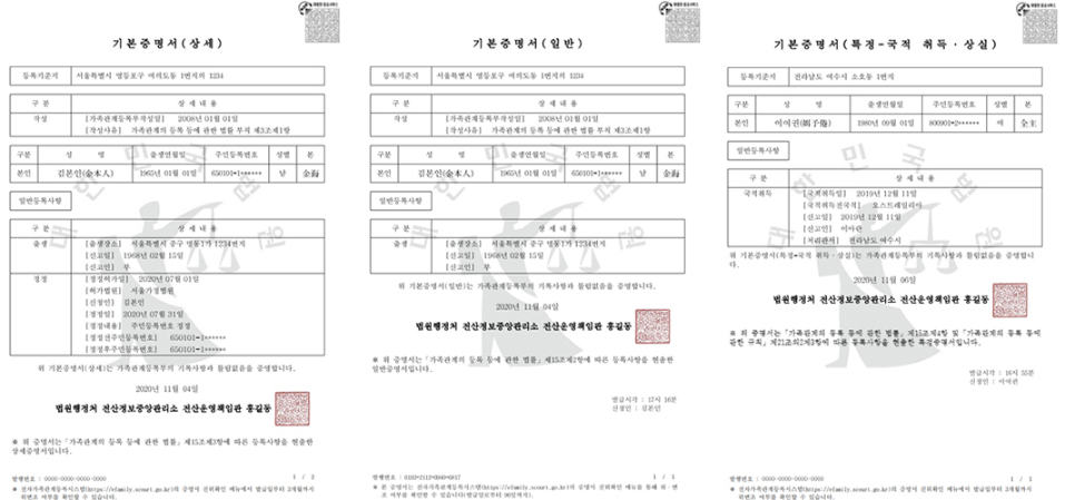 일반 기본증명서: 기본적인 가족관계 정보만 표시되며, 일반적인 용도로 사용됩니다.