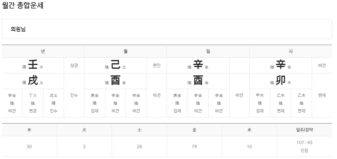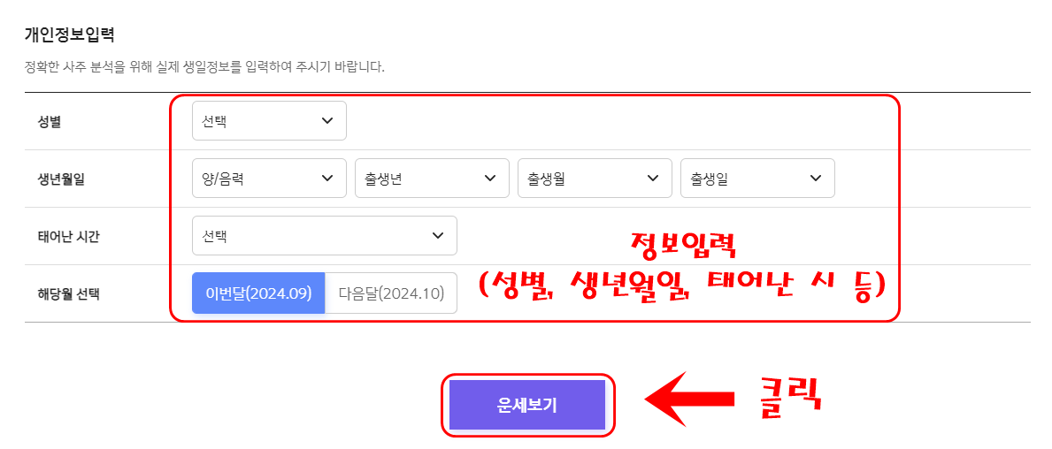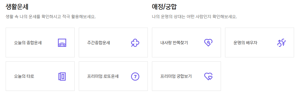 2. 원하는 운세 카테고리 선택 (예: 월간종합운세, 토종비결, 생활운세, 애정/궁합 등)