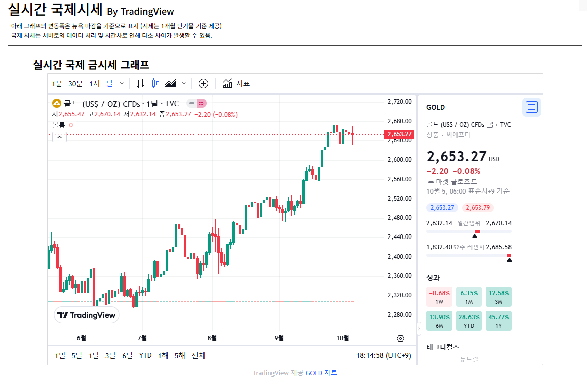 국제 시장에서는 2024년 10월 5일 기준 금 시세가 온스당 2,664 USD로 0.566% 상승했습니다. 전문가들은 만약 지정학적 긴장이 지속될 경우 금 가격이 곧 온스당 2,700달러를 돌파할 가능성이 있다고 예측하고 있습니다.