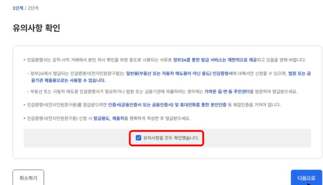 - 서비스 대상 확인: 인감증명서 발급에 대한 유의사항을 꼼꼼히 읽고, 본인이 필요한 용도에 적합한지 확인합니다.
