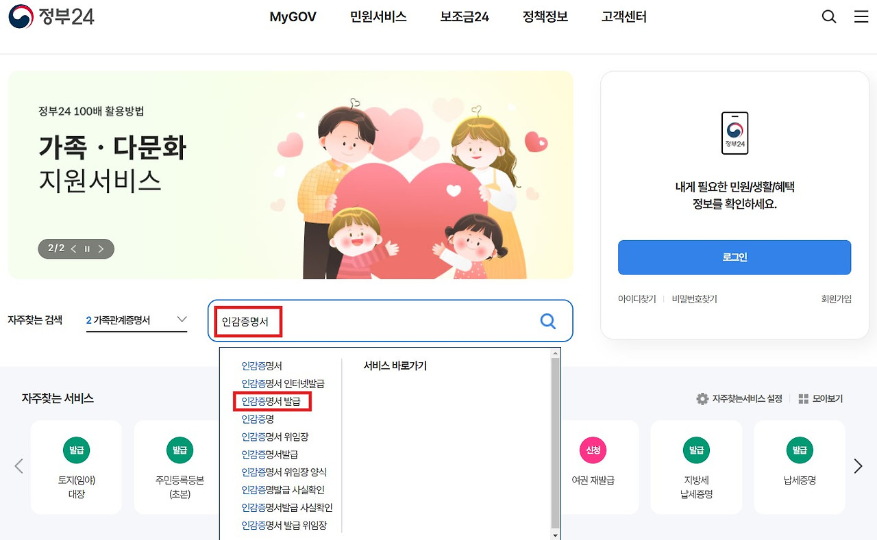 - 서비스 선택: 검색 결과에서 '인감증명서 발급'을 클릭합니다.