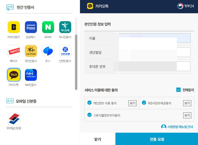- 만약 간편인증(민간 인증)으로 로그인했다면, 휴대폰 본인 인증 절차는 생략됩니다.