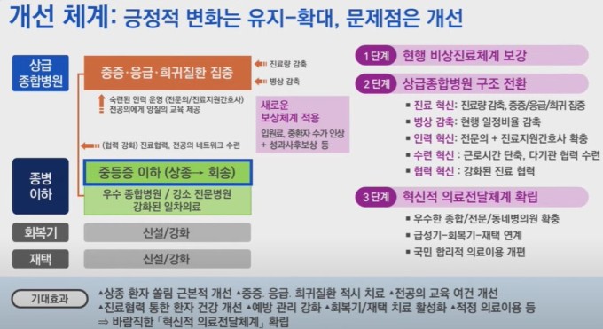 - 첫 번째 단계 는 현재의 의료 시스템을 보강하고, 경증 환자 수를 줄여 중증 환자 중심의 진료 체계를 만드는 것입니다.