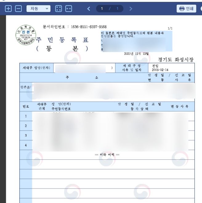 - 주민등록등본: 세대 전체의 정보가 포함되어 있으며, 본인의 주소 변동 이력과 가족 구성원의 정보가 포함될 수 있습니다.