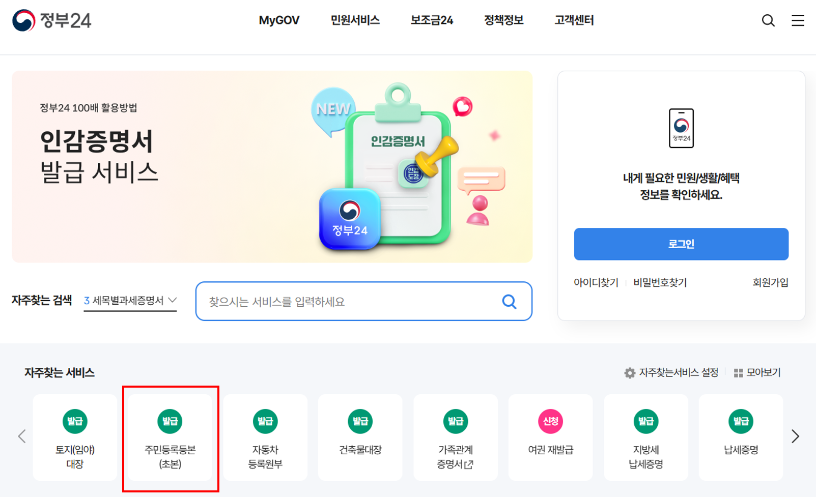먼저 [정부24 홈페이지] 방문합니다. 정부24 홈페이지 메인 화면에서 '자주 찾는 서비스' 메뉴에서 주민등록등본(초본) 을 선택합니다.